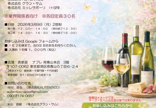 2/5(木)-8(日) たまプラーザ東急 B1Fワイン 2/11(水祝)-17(火) 銀座三越 B3Fラ・カーヴ 3/9(月) 【業務向け】3社合同試飲会 @表参道事前予約制お申し込みはこちら 3/18(水)-24(火...